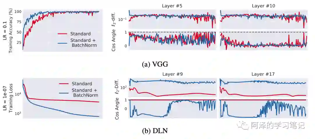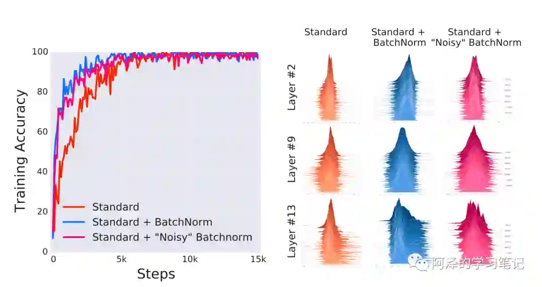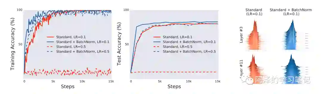 可以看到 BN 可以加快模型收敛并取得更好的效果,但 BN 并不能减少 ICS,反而还会有一定程度上的增加。