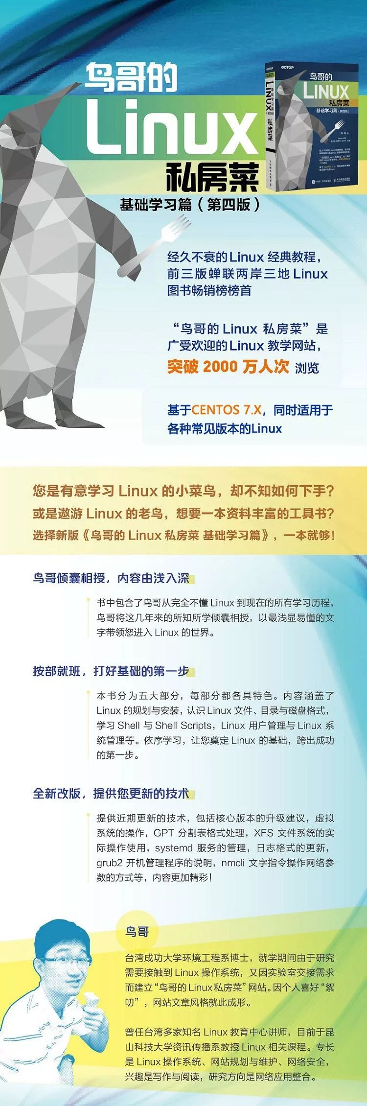《鸟哥的 Linux 私房菜 基础学习篇 第四版 》提供近期更新的技术,包括核心版本的升级建议,虚拟系统的操作,GPT 分割表格式处理,XFS 文件系统的实际操作使用,systemd 服务的管理,日志格式的更新,grub2 开机管理程序的说明,nmcli 文字指令操作网络参数的方式等,内容更加精彩!