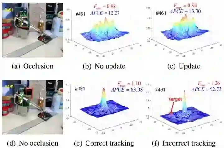 接下来介绍跟踪置信度。 跟踪算法需要能反映每一次跟踪结果的可靠程度,这一点非常重要,不然就可能造成跟丢了还不知道的情况。生成类(generative)方法有相似性度量函数,判别类(discriminative)方法有机器学习方法的分类概率。有两种指标可以反映相关滤波类方法的跟踪置信度:前面见过的最大响应值,和没见过的响应模式,或者综合反映这两点的指标。