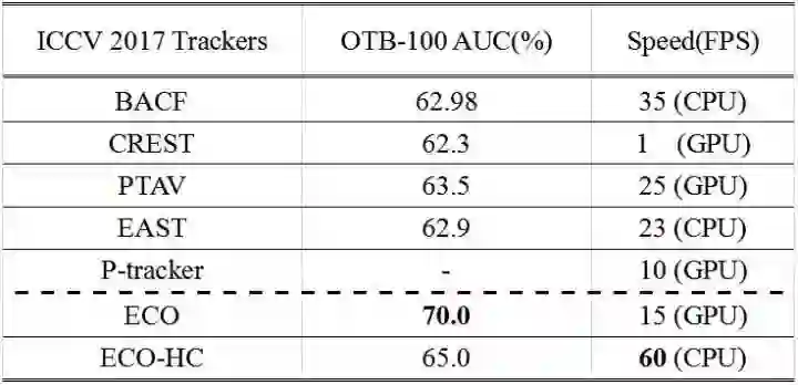 ECO的成功当然还有很多细节,而且有些我也看的不是很懂,总之很厉害就是了。。ECO实验跑了四个库(VOT2016, UAV123, OTB-2015, and TempleColor)都是第一,而且没有过拟合的问题,仅性能来说ECO是目前最好的相关滤波算法,也有可能是最好的目标跟踪算法。hand-crafted features版本的ECO-HC,降维部分原来HOG+CN的42维特征降到13维,其他部分类似,实验结果ECO-HC超过了大部分深度学习方法,而且论文给出速度是CPU上60FPS。
