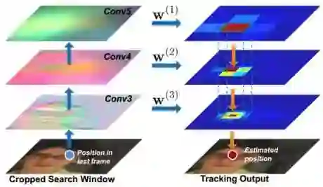 值得一提的还有Chao Ma的HCF,结合多层卷积特征提升效果,用了VGG19的Conv5-4, Conv4-4和Conv3-4的激活值作为特征,所有特征都缩放到图像块分辨率,虽然按照论文应该是由粗到细确定目标,但代码中比较直接,三种卷积层的响应以固定权值1, 0.5, 0.02线性加权作为最终响应。虽然用了多层卷积特征,但没有关注边界效应而且线性加权的方式过于简单,HCF在VOT2016仅排在28名(单层卷积深度特征的DeepSRDCF是第13名)。