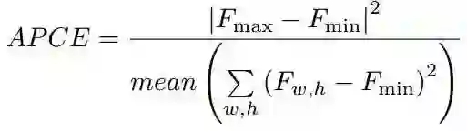 跟踪置信度指标还有,MOSSE中的峰值旁瓣比(Peak to Sidelobe Ratio, PSR), 由相关滤波峰值,与11*11峰值窗口以外旁瓣的均值与标准差计算得到,推荐: