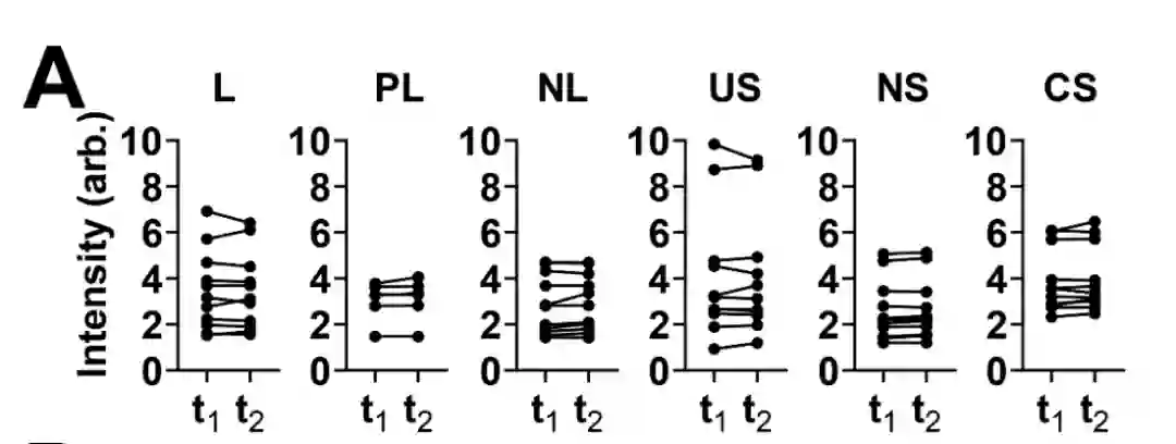 首先,科学家们发现,在任何组中,记忆产生前后的荧光标记的中位值都基本一致: