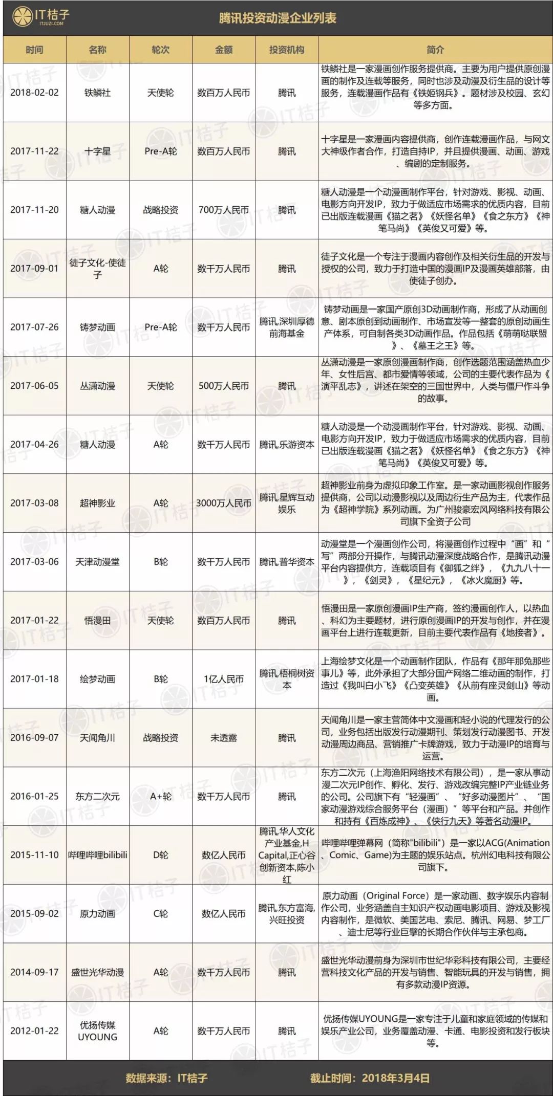 IT 桔子(ID:itjuzi521)统计显示,至今腾讯共投资过 17 家动漫企业,这些企业中大多为动漫制作公司,旗下拥有自制 IP 作品。通过投资这些企业,腾讯增加了自己在动漫 IP 领域的话语权。