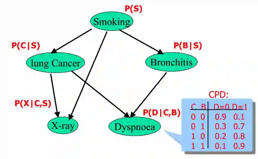 smoking表示吸烟,其概率用P(S)表示,lung Cancer表示的肺癌,一个人在吸烟的情况下得肺癌的概率用P(C|S)表示,X-ray表示需要照医学上的X光,肺癌可能会导致需要照X光,吸烟也有可能会导致需要照X光(所以smoking也是X-ray的一个因),所以,因吸烟且得肺癌而需要照X光的概率用P(X|C,S)表示。