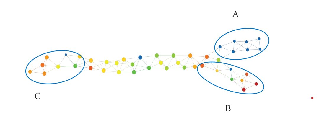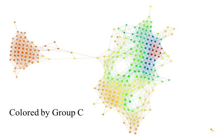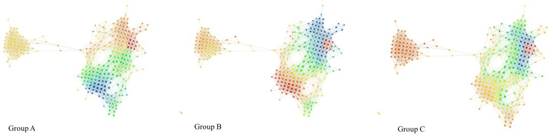 我们也可以看到,C 组似乎是 B 组的一个「较弱」形式,其中右上角的蓝色区域面积较小,下面区域的红色较弱。在左侧的「岛」上,C 组也显示出比 A 、B 组更强的红色着色。理解哪些基因参与了 A、B、C 三组右上角的强红色块将是非常有意思的。此外,研究哪些基因参与了左侧「岛」的表达也很有趣。了解这些基因组需要使用各种基于网络的生物学通路分析的工具。