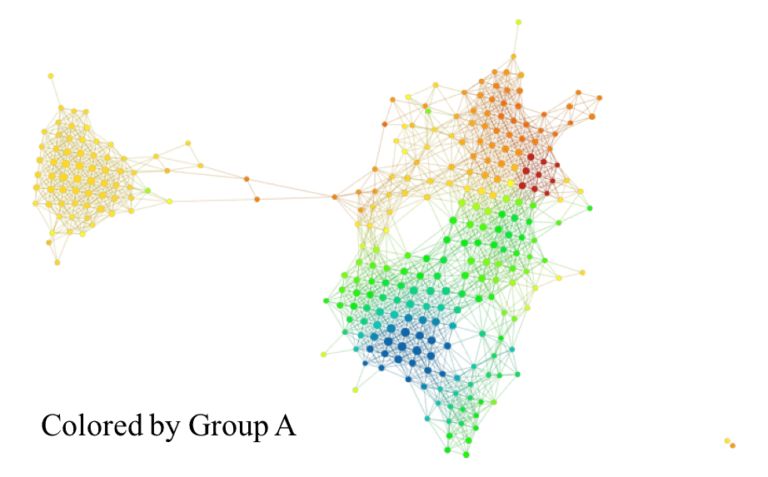 我们将把它记为 fi,G。当这个数字包含 i 时,我们在 M^T 的行集合上获得一个函数。因此,再次重申,M 矩阵中的行的一个子组将在 M^T 的行集合上产生一个函数。Ayasdi 拓扑模型的功能之一是,通过对应于节点的行,能够利用数据矩阵的行函数的平均值对拓扑模型的节点进行着色。这对于了解数据属性而言是一个非常有用的方法。尤其地,我们现在可以利用 M^T 矩阵的行集合中子组 G 的着色情况,查看该组的特征。