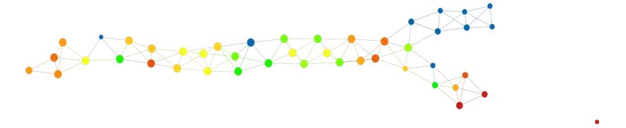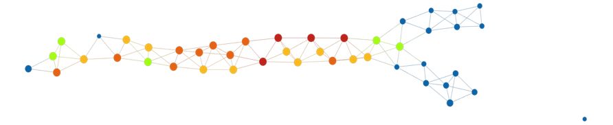 上图表明,拓扑模型包括一个很长的「树干」部分,然后分裂成两个「小枝」。在数据集中,存在一个名为 eventdeath 的二进制变量。如果患者在研究期间存活,则 eventdeath = 0;如果患者死亡则 eventdeath = 1。令人感兴趣的是,患者存活情况与图的结构相对应。一种方法是通过变量 eventdeath 的平均值进行着色。其结果如下所示。