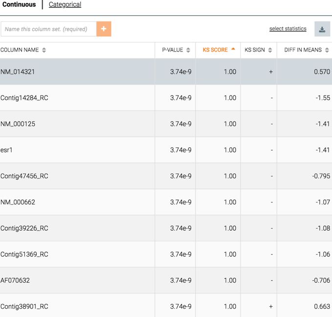 如果选择其中的两个子组,Ayasdi 技术允许研究者根据他们的 Kolmogorov-Smirnov 分数(KS 分数)生成特征列表。每个特征有两个分布——每个子组各有一个分布。KS 分数衡量两个子组之间的差异。与本结构相关的也就是标准统计意义上的 P 值。