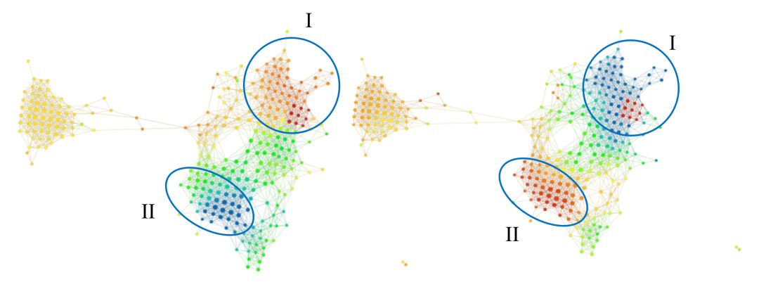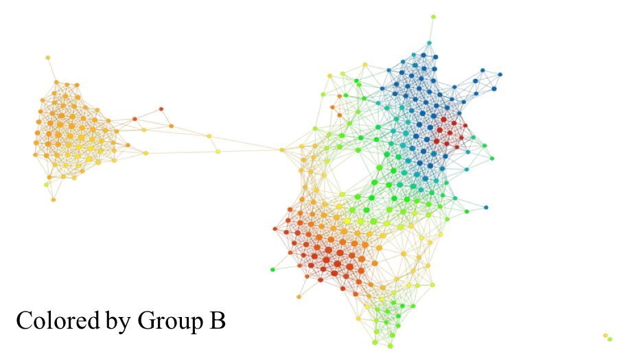 组 I 和组 II 的颜色明显不同。组 I 在 A 组中主要为红色,而在 B 组中主要为蓝色(小固相区域除外)。组 II 恰好相反,在 A 组中为蓝色,在 B 组中为红色。这些组可能与高雌激素受体表达有关,其中在组 I 中呈正相关,在组 II 中呈负相关。众所周知,雌激素受体表达是乳腺癌存活与否的「强信号」。如果我们比较所有三组(如下图):
