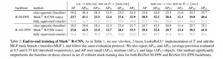 由于没有注释可用,因此他们无法在 VG 数据集上显示精确度。 所以他们把这个想法应用到可以证明结果的数据集上。PASCAL-VOC 有 20 个等级,在 COCO 中都很常见 。因此,他们使用 VOC 分类标签进行培训,并且只使用来自 COCO 的 bbox 标签对这 20 个类进行训练。 针对在 COCO 数据集的 20 个类的实例分割的任务的结果如下. 反之亦然,因为这两个数据集中都有真实值(Ground truth),这个结果列在下面的表格中。