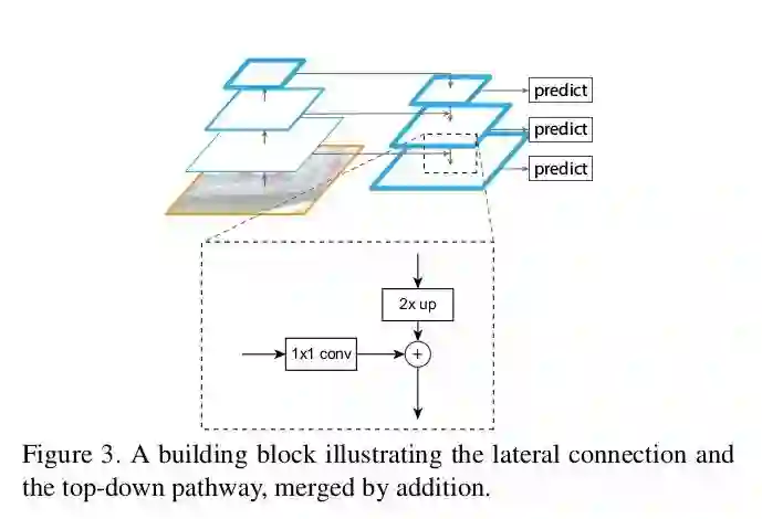侧向连接:通过 1x1 卷积并与经过上采样的从上到下连接的结果相加求和。自上而下的部分生成粗粒度特征,自下而上的部分通过侧向连接加入细粒度特征。原文的图示表达的非常明了。