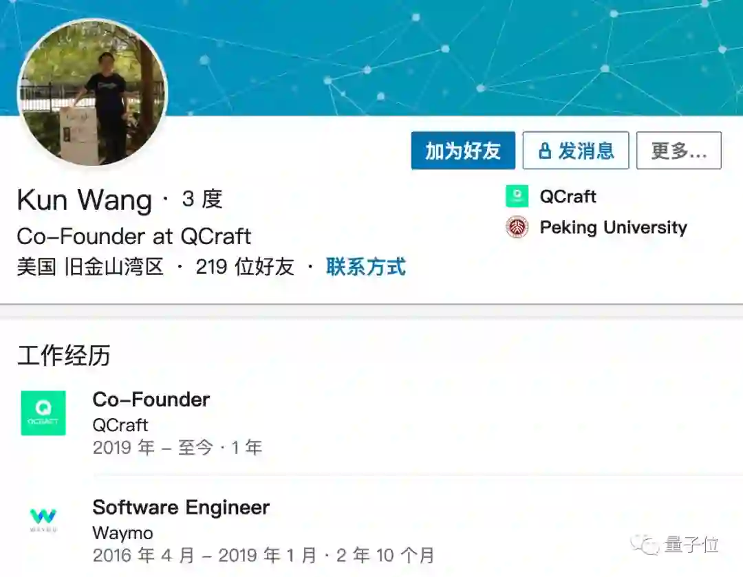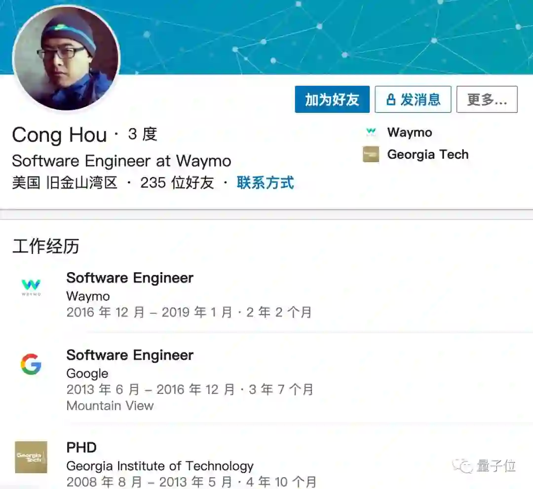 2013年在Google中国实习,其后2014年入职Google,是直接从Google中国进入Waymo的第一人。