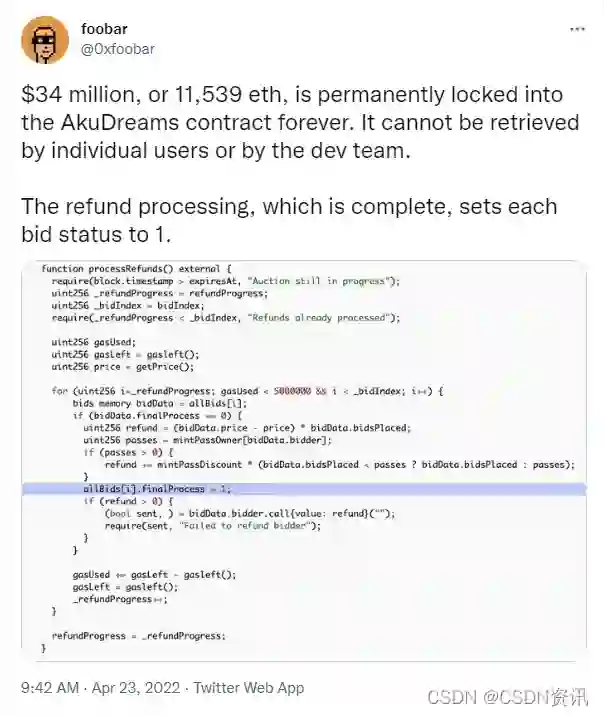 从foobar贴出的代码来看,该智能合约代码存在两个bug,第一个是用户完成投标后,状态会设为1;第二是竞标失败后退款条件状态为,因此用户无法申请退款,开发团队也无法取款,因为refundProgress ≥ totalBids,totalBids 是卖出量,而代码应该针对是的报价人数——对应 bidIndex。