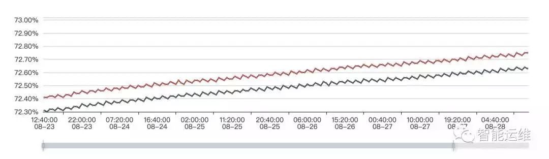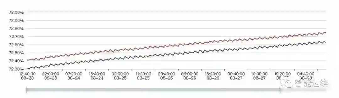 对于很多有趋势规律的场景,可以通过提前预警的方式,降低问题的紧迫程度和严重性。下图是两台机器一周内的磁盘使用率监控图,可以预见,按照目前的增长趋势,必然会在某一个时间点触发磁盘剩余空间 5% 的报警,可以在剩余空间小于 10% 的时候,通过工单或者其他非紧急方式提醒,在工作时间段内,相对从容的处理完毕即可,毕竟 10% 到 5% 还是需要一个时间过程的。