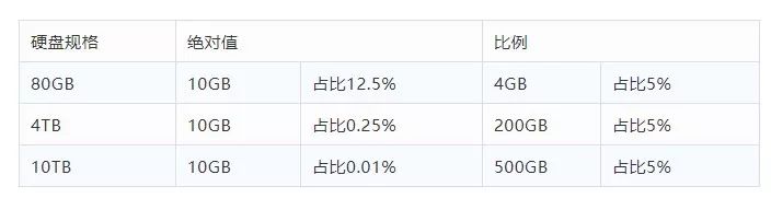 线上机器的规格不同,如果从绝对值角度进行监控,则无法适配所有的机器规格,势必会产生大量无意义的报警。以磁盘剩余空间监控为例,线上规格从 80GB 到 10TB 存在多种规格,从下图表格看,比例比绝对值模式能更好的适配各种规格的场景(EXT4 文件系统的默认预留空间为 5%,也是基于比例设置的并可通过 tune2fs 进行调整)