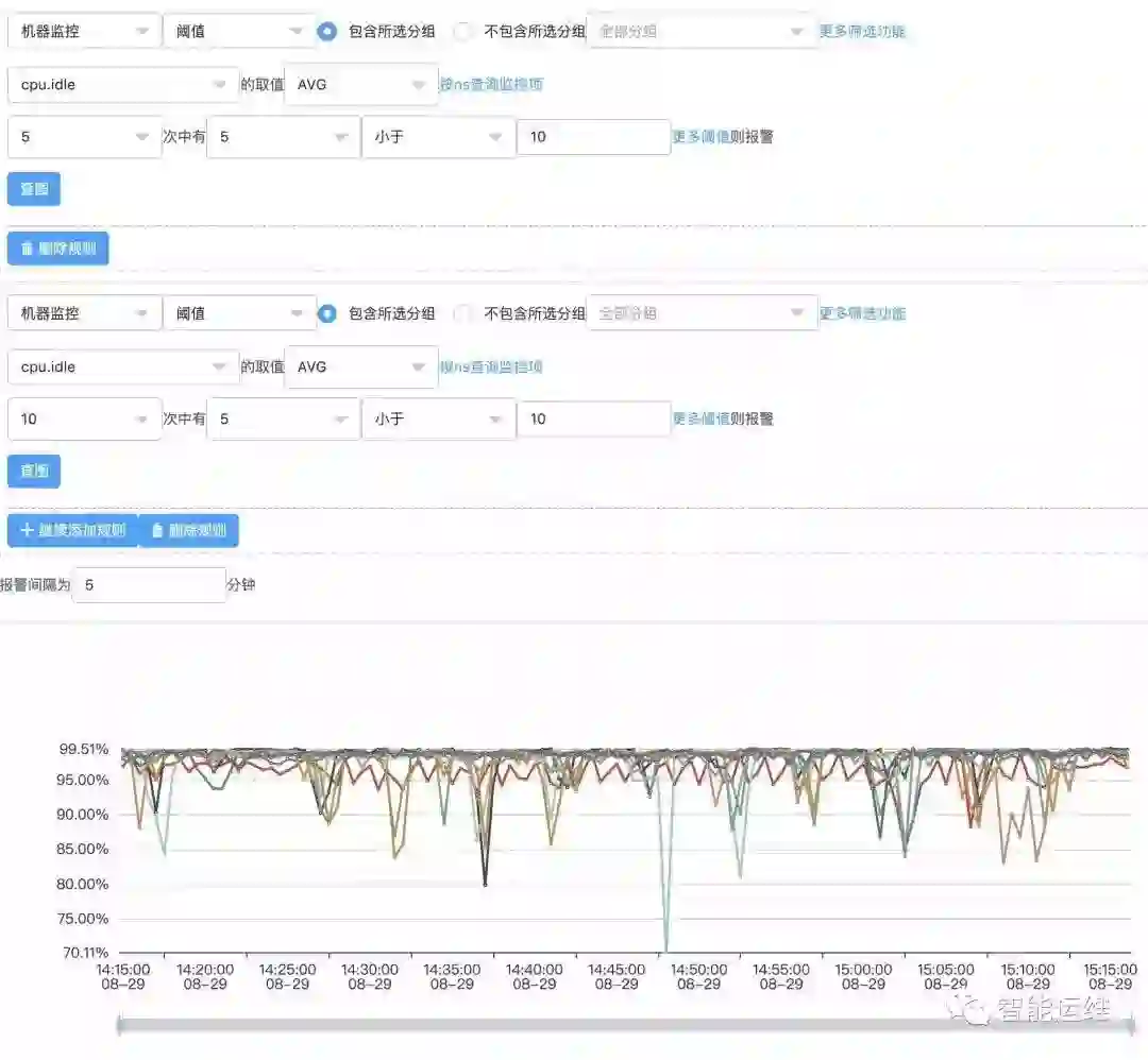 以 CPU 瞬报为例,如果设置采集周期为 10s,监控条件为 CPU 使用率大于 90% 报警,如果设置每次满足条件就报警,那么就会产生大量的报警。如果设置为连续 5 次满足条件报警,或者连续的 10 次中有 5 次满足条件就报警,则会大幅减少无效报警。对于重要服务,一般建议为在 3min 内,至少出现 5 次以上异常,再发送报警较为合理。
