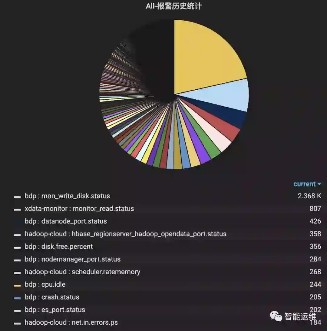 TOP-3 只是报警仪表盘数据分析的典型场景之一,在 TOP-3 之后,还可以对报警特特征进行分析,如哪些模块的报警最多,哪些机器的报警最多,哪个时间段的报警最多,哪种类型的报警最多,进而进行细粒度的优化。