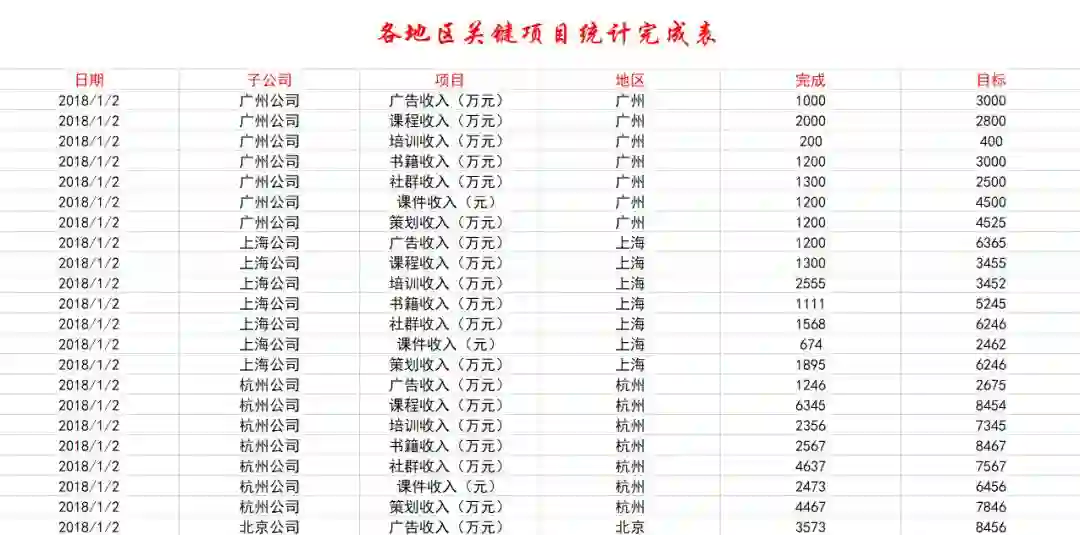 年终汇报,老板让你们完成一份各地区关键项目完成指标情况报表,别人给老板的是这样死板的表格。