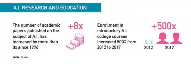 在人工智能的研究和教育方面,HAI 援引 AI index 统计的学术论文发表数量和登记为「人工智能入门课程」的大学课程数量。其中学术论文发表数量方面,自 1996 年以来,关于「人工智能」主题的学术论文发表数量翻了 8 倍以上;而 2012 年至 2017 年,大学课程中登记为「人工智能入门课程」的课程数量的增长量高达 500%。这无疑彰显了学术界对于「人工智能」研究的极高热情。