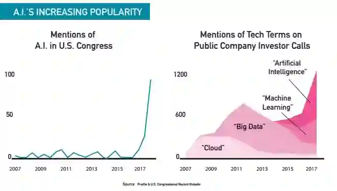 随着人工智能的发展,美国国会提到「人工智能」的频率也日益增高,2017 年以前,美国国会提及「人工智能」的次数微乎其微,最高也不到 20 次,然而在 2017 年提及的次数竟飙升至近 100 次,这也从侧面展示了各国已经将人工智能布局提升到了国家战略布局的高度。