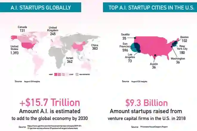 同时,Asgard CB Insights 还收集了美国各城市所拥有人工智能初创数量的数据,其中旧金山有 596 家,排名第一;纽约有 180 家,排名第二;波士顿有 102 家,排名第三;之后依次是洛杉矶、华盛顿、奥斯汀、西雅图,分别为 73 家、36 家、36 家以及 35 家。另外据 Pricewaterhousecoopers,2018 年美国初创公司从投资公司募集到的融资总额为 93 亿美元。