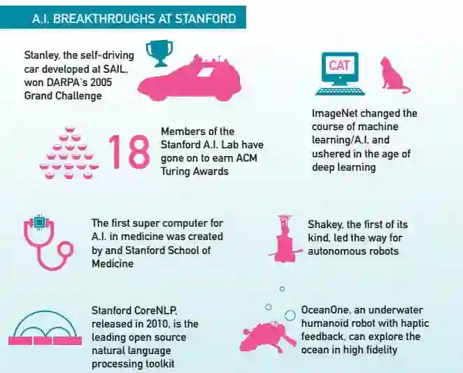 而对于人工智能领域所取得的突破性成果,HAI 则重点列举了在人工智能领域具有代表性意义的高校——斯坦福大学的研究成果,包括: