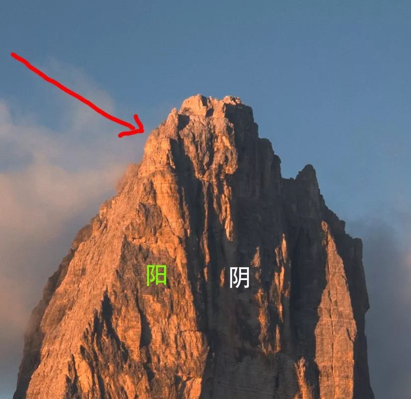 比如这张图片,我们可以根据山峰受光面和背阴面的相对方位判断出阳光是从左上方射入