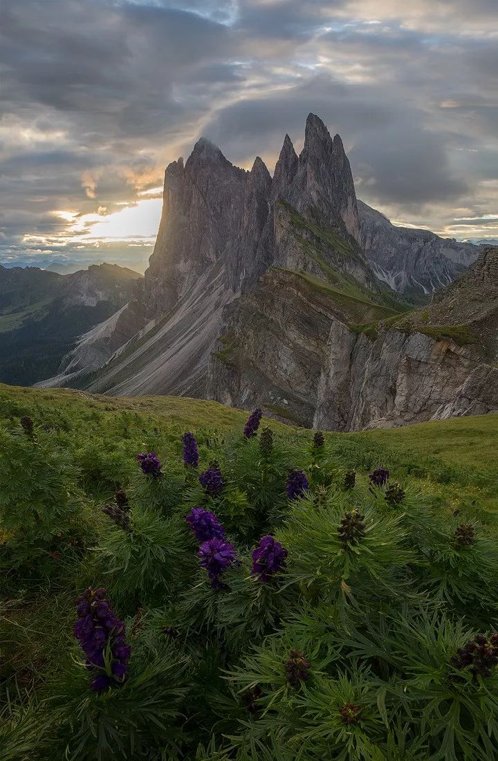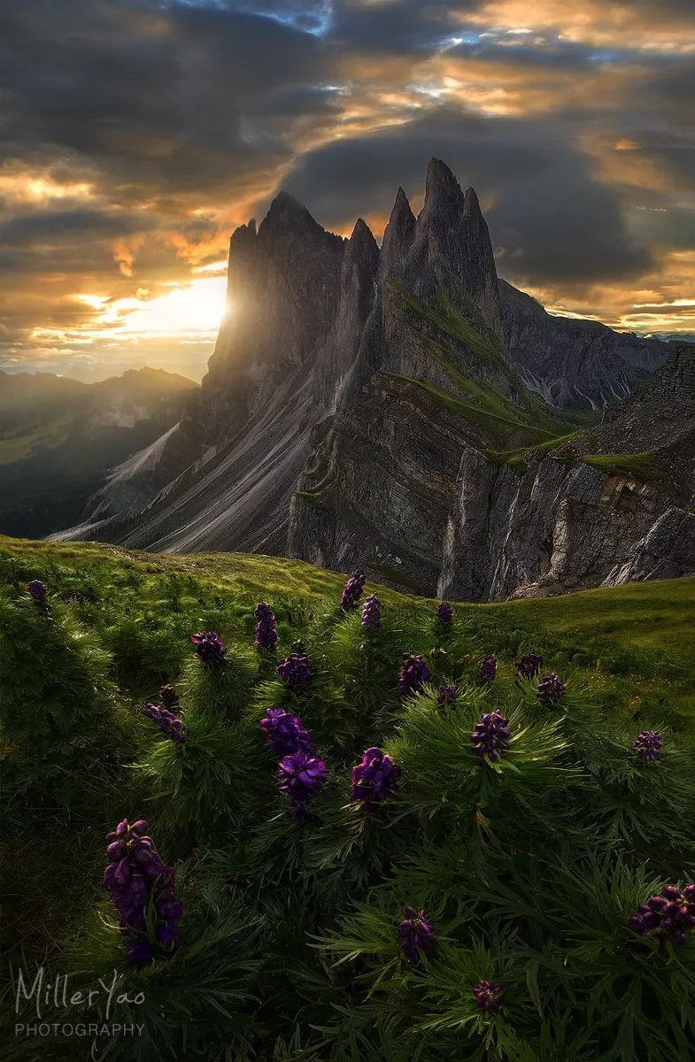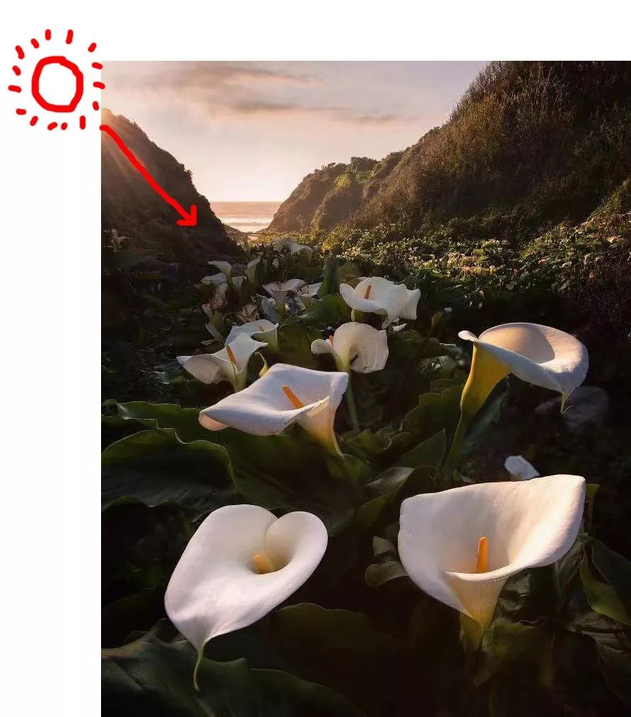 远处的溢光为视觉在远景提供了落点。前景的花朵一直蔓延向远方的山谷——这是这张图片视觉流动的方向。也更符合这张图片的元素所呈现出来的构图意图