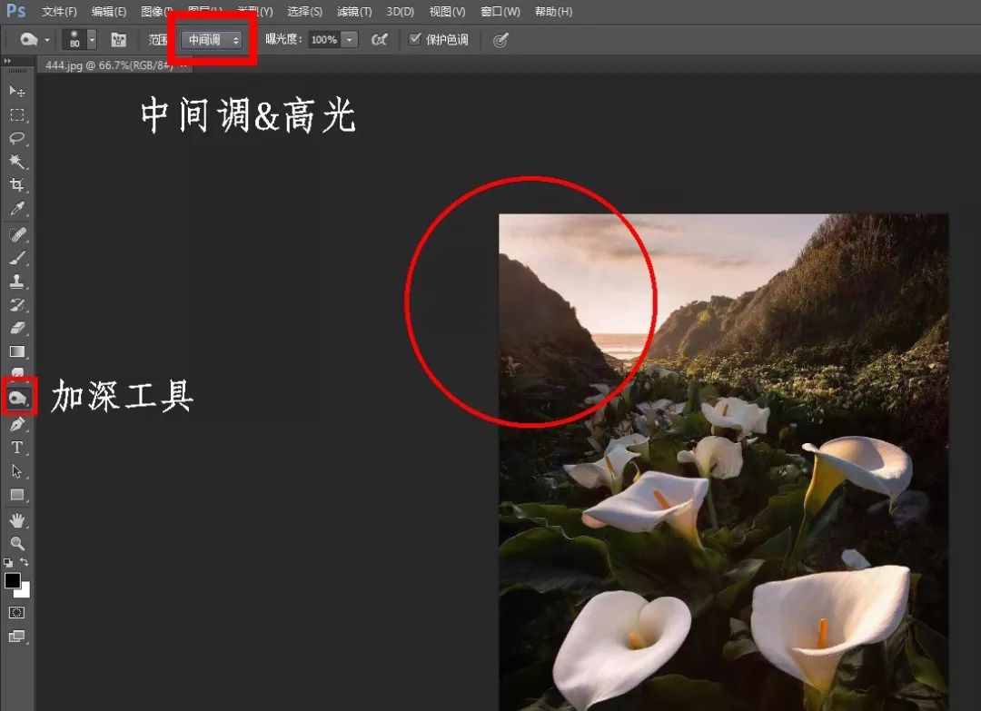 再用加深工具,依次选择中间调和高光对山体进行压暗,去除原本太阳溢光处的高亮。