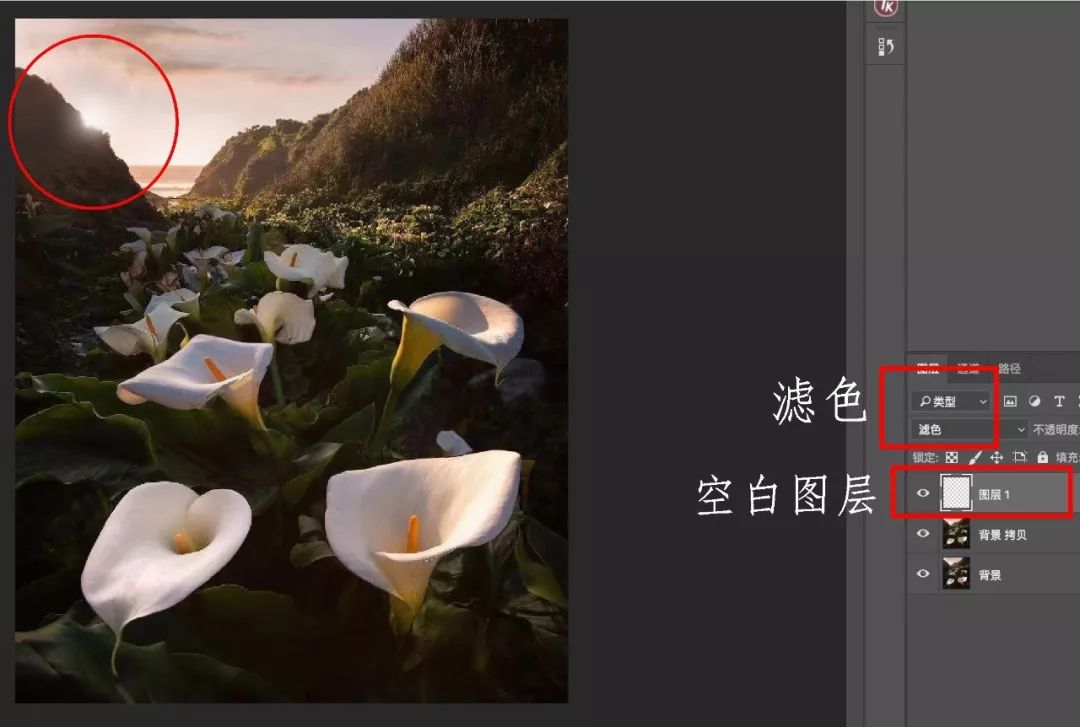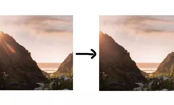 去除了左上角的炫光,图片在视觉上已经没有原图那么的凌乱了。但是我们还需要将太阳移动到一个新的位置去加强以及塑造光感,同时,让视觉在远方有一个落点。