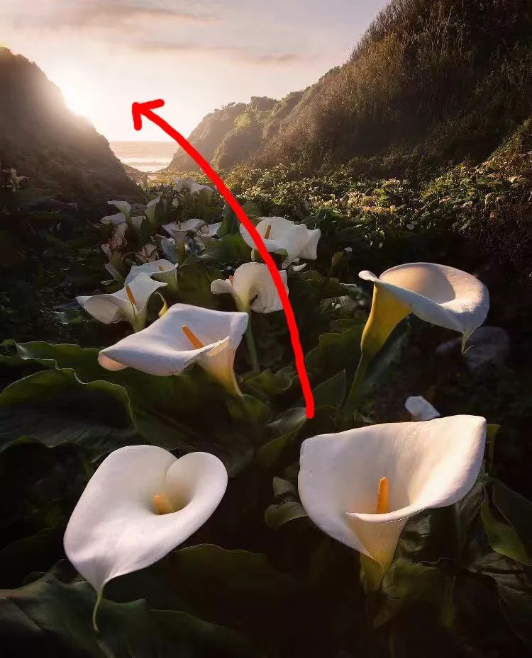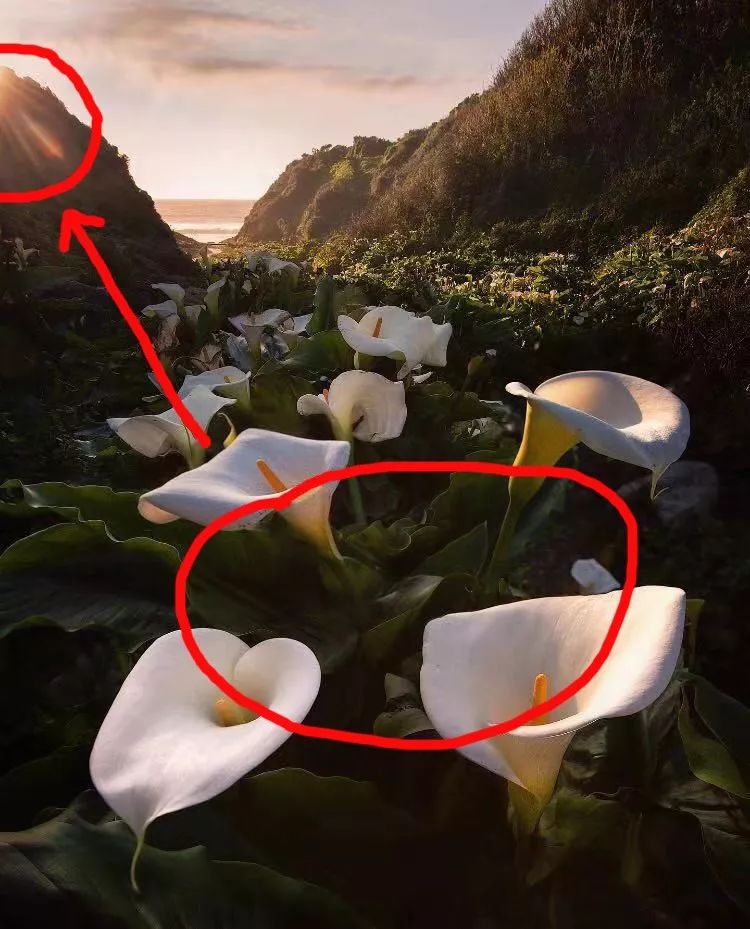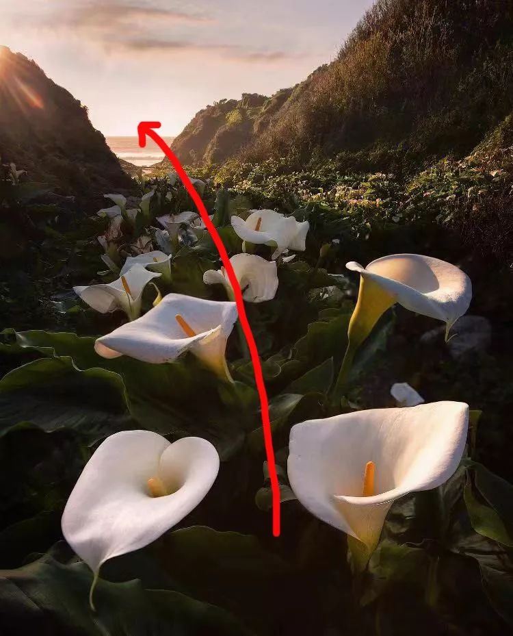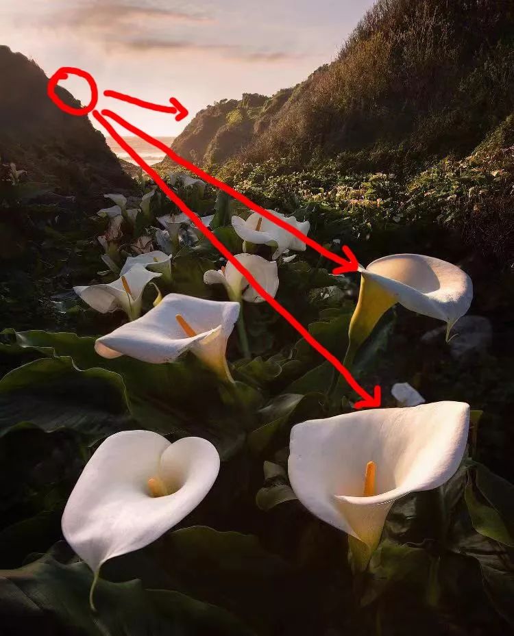 这是网友@hongzimao在美国加州拍摄的马蹄莲。这是一张来自经典机位的图片。首先,我来分析一下该图