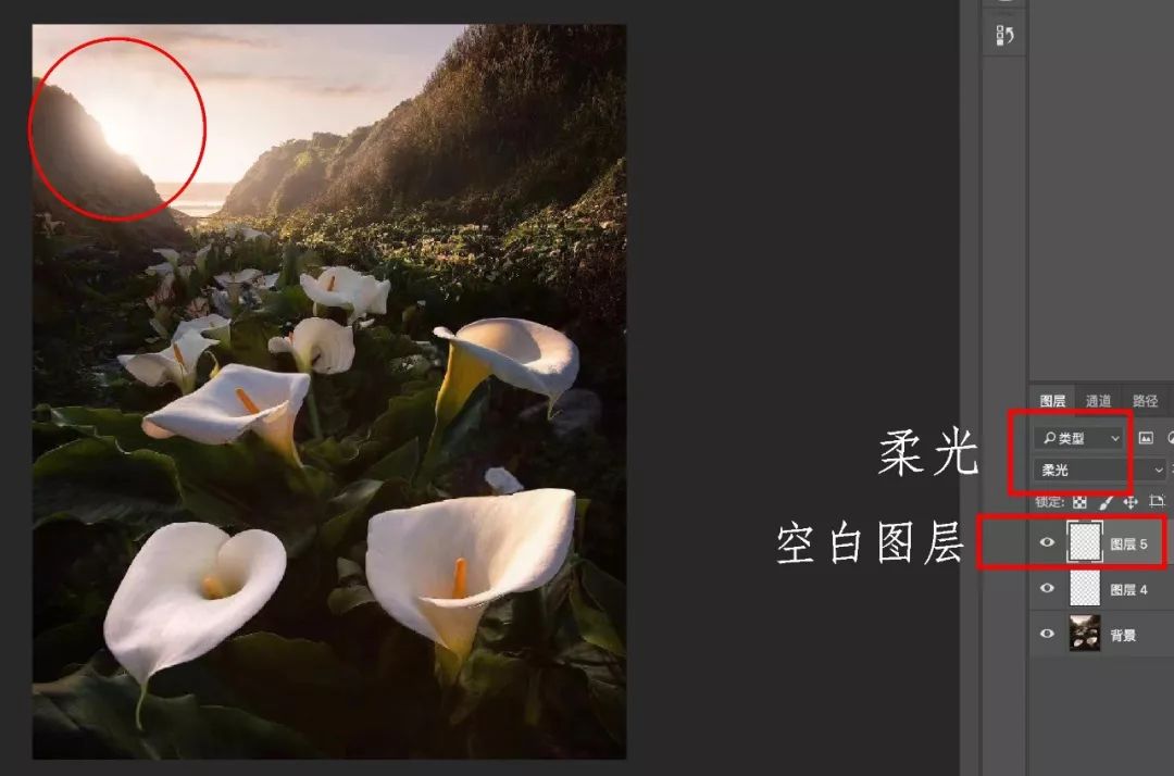 接下来我们要根据原始图片的阴影走向,在图片的一个大概的光源范围加上新的太阳