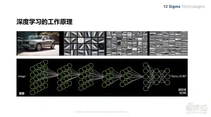 这个图就是深度学习早期时候的一些文章,显示它训练出来的特征向量,我们可以看到,其实在前几层的时候,深度学习选出来的特征向量跟人选出来的特征值是非常接近的。比如各种不同角度的edge detection,以前人类来设计特征向量也有各种角度多个尺度的Gabor Filter Bank等这些设计,相比来说其实是非常类似的。但是人没办法进入更高层的抽象,所以导致识别的效率没有那么高,可以看到,在后面几层识别出来的这些特征,就比较接近每个元部件的组成。