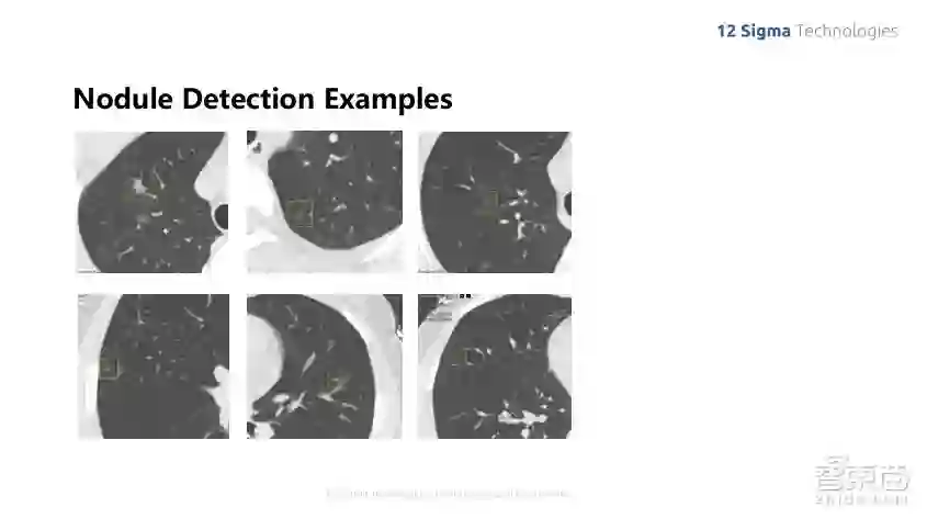 上面这张图就显示了几个我们检测到的结节,一般结节看起来是什么样子的呢?我们可以看到,肺部的结节种类是非常多的,尤其是在中国,有不少毛玻璃类型的结节,他们之间的对比度非常弱,也非常小,我们可以看到它跟边上的血管、气管对比度要弱很多,但是由于我们是利用深度学习训练出来的模型进行识别,它是自动进行的,可以看到3D的图像,不光是在二维层面去看这个图像,同时可以制造上下层之间的关系,利用整个空间信息来最终实现结节的诊断。