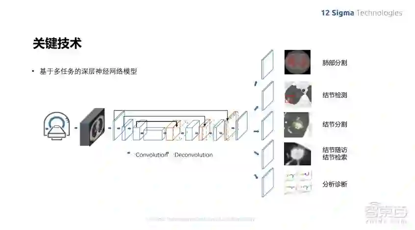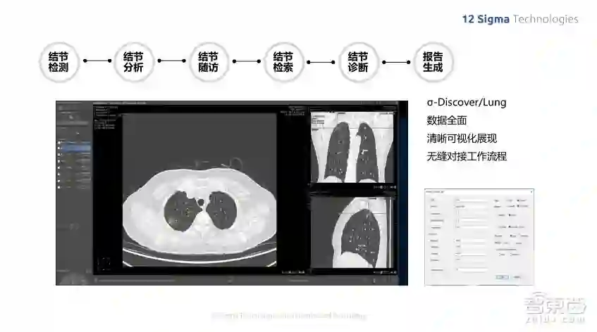 我们的肺结节诊断系统实现了多个功能,就像前面列的在医疗场景里的应用一样,我们需要帮助医生实现好几个不同的功能,包括结节的检测、对结节进行分割,然后给一些定量定性的分析,也可以对结节的不同时期的随访病人跟踪其每个结节在时间上的变化,然后是结节的检索,可以看出过去类似结节的分析结果,以及对结节做出最终的良恶性判断,判断它是哪个类型的,是良性还是恶性,最后还可以自动生成报告,整个流程极大地加速了医生的诊断过程。
