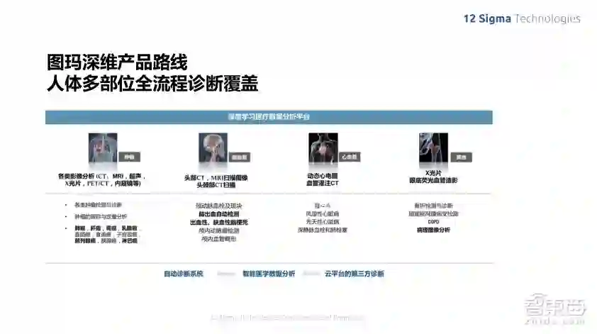 图玛深维目前主要专注于医学影像分析。现代医学影像取得重大进步的一个原因,其实就是基于不同成像设备的巨大发展,比如CT断层成像、核磁共振扫描、三维超声等,都可以在没有创伤或微创的情况下,观察人体内部的细微组织结构,在疾病的早期检测、找到疾病的病因以及病灶位置方面带来了极大的增强,从而可以让医生尽早确定治疗方案。另外,在人体的不同部位,不同疾病的表现方式也都不太一样,检测方法也不一样,因此图玛深维的产品针对不同的成像仪器,涵盖了人体的多个部位,来对一些高发以及高危的疾病进行智能辅助诊断。现在我们着重的是比较高危害的疾病,包括各种恶性的癌症、心血管常见疾病以及脑血管疾病等。
