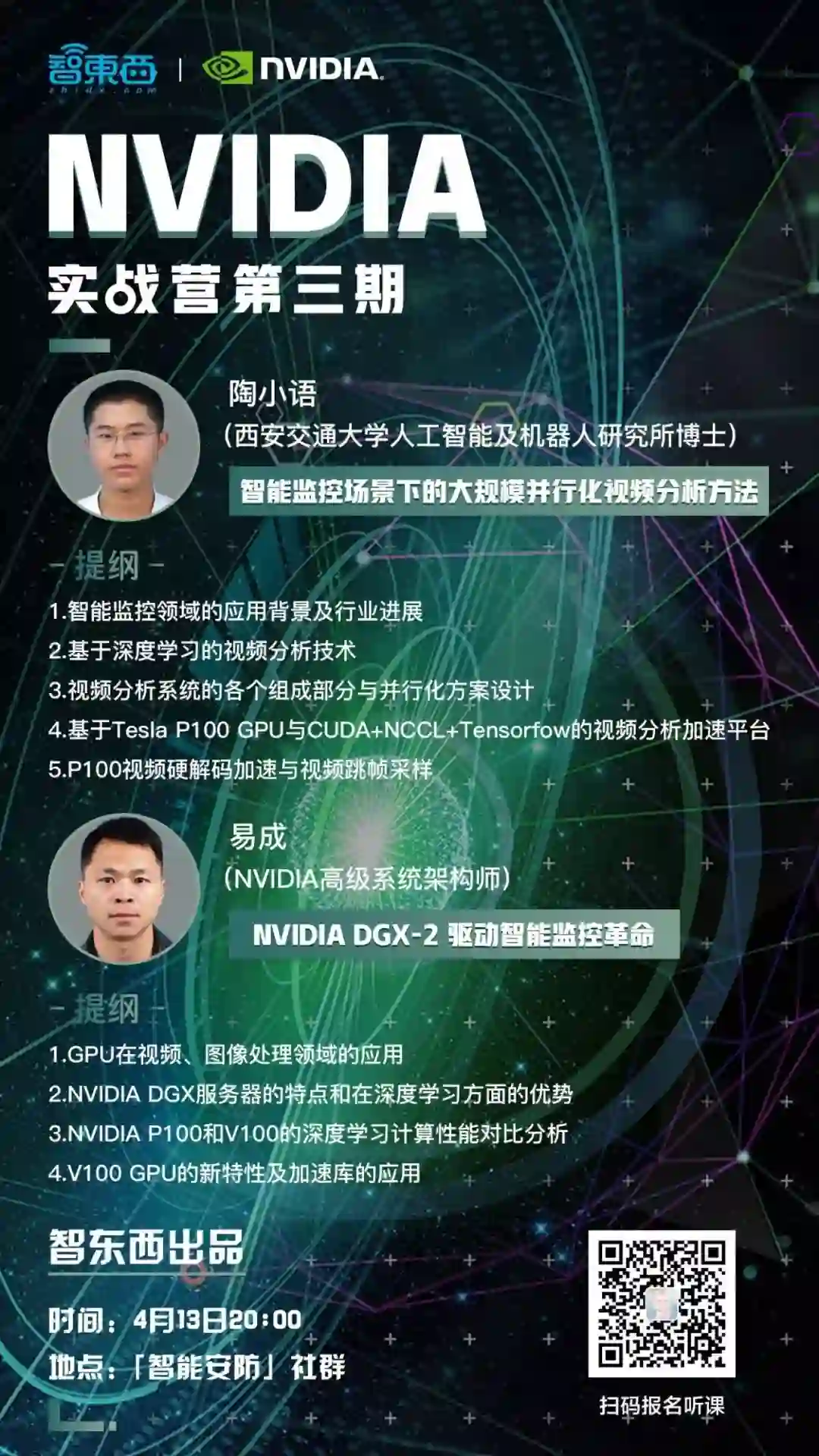 #智东西出品#本周五晚8点,NVIDIA实战营第三期将在「智能安防」社群开讲,西安交通大学人工智能和机器人研究所博士陶小语、NVIDIA高级系统架构师易成将围绕《智能监控场景下的大规模并行视频分析方法》这一主题展开深度讲解,长按二维码报名(或者点击底部「阅读原文」填写主群申请表),免费入群听课。