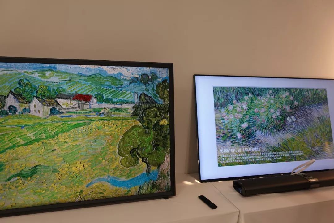 京东方展示的画屏(左)与普通智能电视(右)显示艺术作品效果差异(图片来源:作者拍摄)