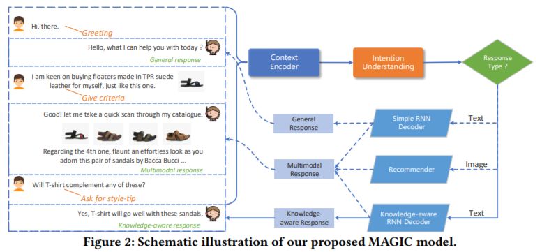 摘要:站在文本对话系统的肩膀上,多模态对话系统最近引起了越来越多的关注,尤其是在零售领域。尽管多模式对话系统具有商业价值,但它们仍面临以下挑战:1)以适当的媒体形式自动生成正确的回复;2)在选择产品图片时,共同考虑视觉提示和辅助信息;3)利用多方面的异构知识指导响应的产生。为了解决上述问题,我们提出了一种具有适应解码器的多模态对话系统,简称为MAGIC。尤其,MAGIC首先通过理解给定多模态上下文的意图来判断响应类型和相应的媒体形式。此后,它采用自适应解码器来生成所需的响应:简单的递归神经网络(RNN)用于生成一般响应,然后一种考虑知识的RNN解码器被用来编码多形式的领域知识以丰富响应,多模态响应解码器使用了一个神经图像推荐模型,该推荐模型同时考虑了文本属性和图像视觉信息,该模型是使用max-margin损失进行优化的。我们在基准数据集上通过对比验证了MAGIC的合理性。实验结果表明,MAGIC的性能优于现有方法,并达到了最先进的性能。