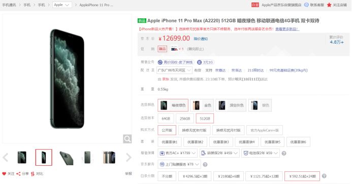 比如现在京东上,顶配 iPhone 11 Pro Max 最高可以分 24 期,但没有任何优惠,需要多支付 1521 元的利息费,明显不划算。苏宁暂时也没有分期优惠,同样要支付额外的费用。