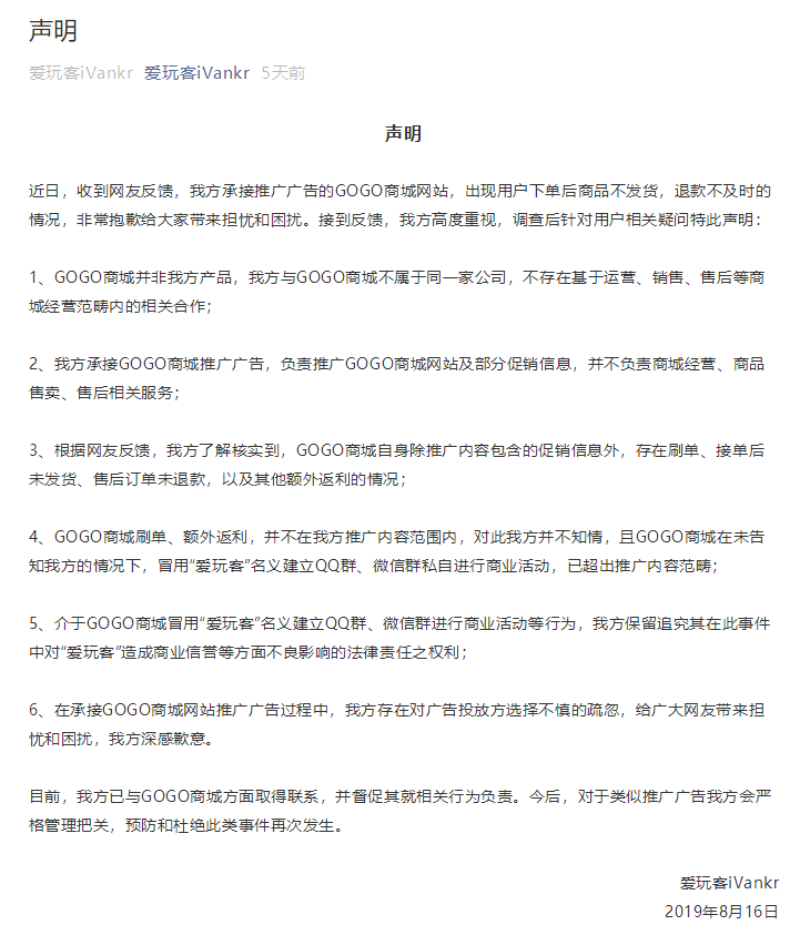 爱玩客方面则发表声明,称与 GOGO 商城不存在运营、销售、售后等商城运营范围内的相关合作,自己只是承接 GOGO 商城的推广广告。随后,爱玩客又表示将向司法部门起诉 GOGO 商城负责人曾磊及其关联公司“沈阳博聚创思传媒有限公司”。同时,B站也封停与爱玩客相关的两个账号。