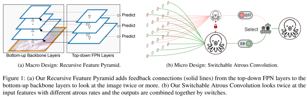在宏观层面上,作者提出了递归特征金字塔(RFP,Recursive Feature Pyramid),它结合了从特征金字塔网络到自下而上的backbone层的额外反馈连接,具体如图1(a)所示。
