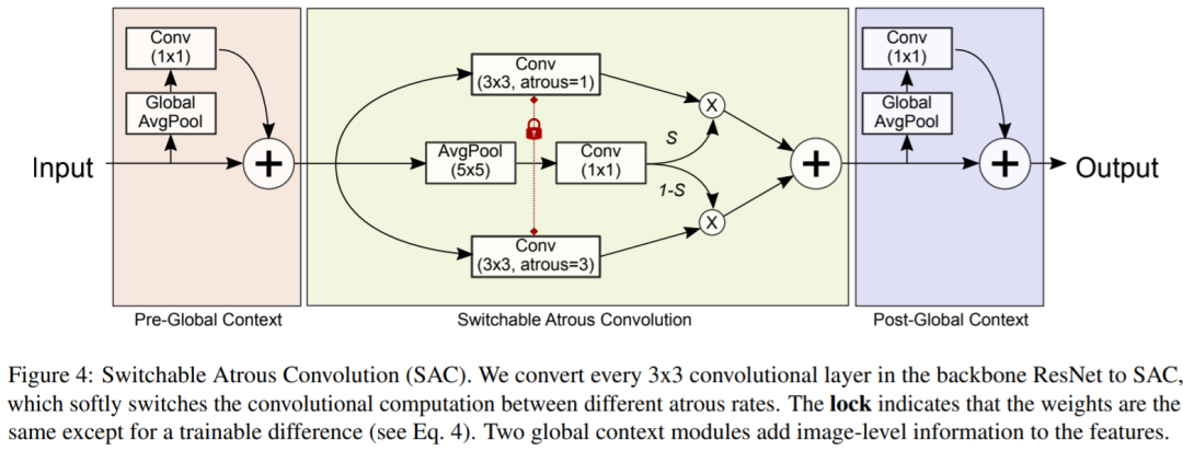 在微观层面上,作者提出了可切换的空洞卷积(SAC,Switchable Atrous Convolution),它以不同的atrous rate对特征进行卷积,并使用switch函数收集结果,具体如图1(b)所示。