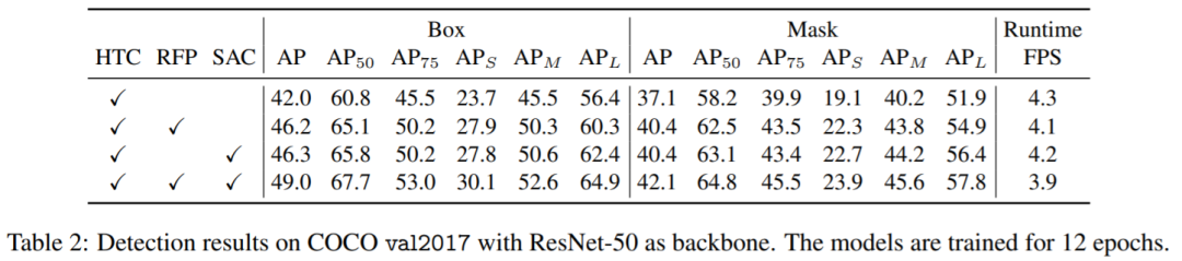 看一下,HTC(基于ResNet) + RFP + SAC 的涨点情况,直接从42.0 AP涨到49.0 AP