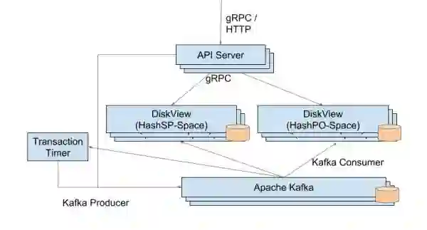 Beam 的详细实现如图二所示。其中,日志接口采用模块化设计。Beam 当前推荐使用 Apache Kafka 实现日志,支持新日志在确认前持久化写入磁盘的配置。Beam 已提供了一种称为“DiskView”的单视图实现。DiskView 支持以两种运行模式,即分别根据知识图谱事实条目的“主体 - 谓词”和“谓词 - 客体”组合构建索引。典型的 Beam 部署将对每种模式各建立三个基于多划分的副本。DiskViews 使用同样支持模块化的 RocksDB 存储事实条目。API 服务器提供复杂的查询处理器,我们将在下面详细介绍。Beam 提供称为事务计时器的轻量级进程。在 API 服务器出现故障而导致事务处理缓慢时,事务计时器将对事务做超时处理。