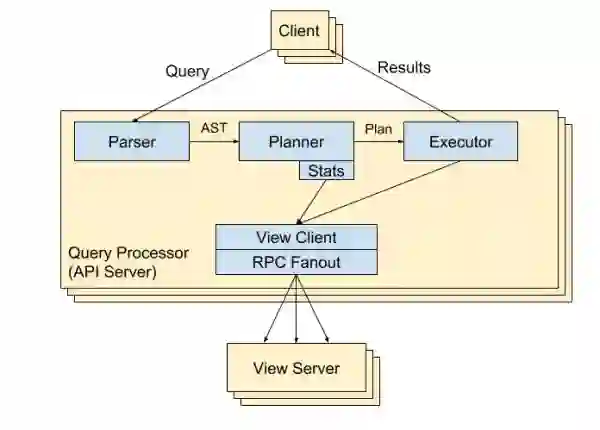 API 服务器提供了丰富的功能,难以用一个简单的框图表示。API 服务器中实现了整个查询处理器,如图三所示。Beam 的查询处理器实现了一种类似于 SPARQL 子集的查询语言,语法类似于 SQL 语句,但适用于知识图谱查询。查询处理器包括解析器、基于代价的查询规划器和并发执行引擎。解析器将初始查询语句解析为抽象语法树(AST)。查询规划器为抽象语法树添加数据统计信息,进而给出高效的执行计划。查询执行引擎运行执行计划,使用批处理和留处理方式实现高性能查询。执行引擎基于 View Client/RPC Fanout 模块,从多个视图服务器高效获取数据。详细信息,参见项目 GitHub 代码库提供的 docs/protobeam_v3.md。