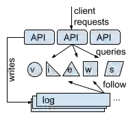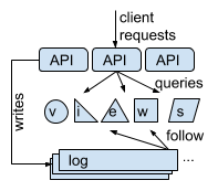 Beam 的架构如图一所示,其架构围绕一种中心化日志构建,图中每个框图表示了分布式网络中的一个独立进程。中心化日志并非一个新概念,已在 Tango 等系统使用,但并未得到普遍重视。Beam 中,所有的写入请求排序写入一个只添加的中心化日志。日志作为网络服务,在分布式系统内部多次复制,实现容错和持久化。多个视图服务器(view server)分别读取日志,顺序应用其中的条目,并确定性地更新各服务器的本地状态。因此,不同的视图服务器维护着不同的状态。API 层接收来自客户的请求,将写入请求附加到日志中,并从视图服务器获取数据以响应读取请求。