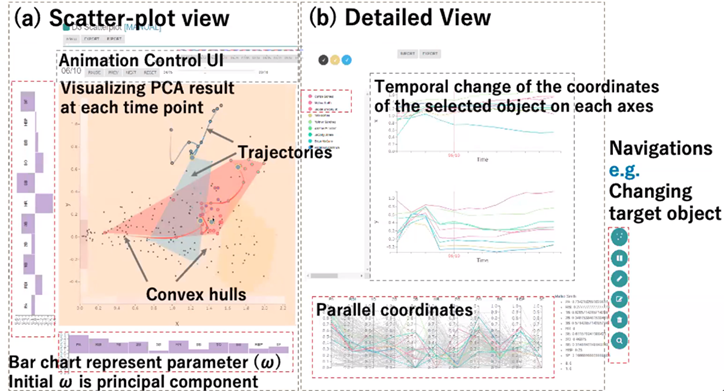 在该工作中将度量表示为数据属性的线性组合,并提供了一种通过交互式 VA 调整它的方法。在动画散点图上,分析人员可以直接操作几个可视化对象,即节点、轨迹和凸包,作为节点和轨迹的组,如图10所示。操纵对象的结果反映在属性的线性组合中,它对应于散点图的一个轴。使用轴作为分析的输出,分析师可以制定一个指标。