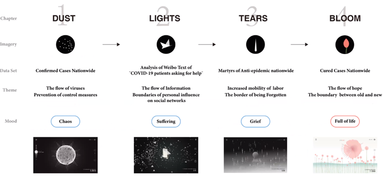 如图12所示,展示流动的边界——新冠疫情交互式叙事可视化设计实践的主要流程。以第四章:春华为例,可视化并叙述了全国累计治愈病例。